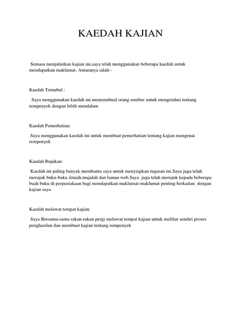 Tinjauan dan temu bual digunakan untuk mendapatkan . Sebagai contoh, pengkaji boleh menentukan empat orang guru yang mengajar sesuatu mata pelajaran dalam kelas dan melihat kaedah pengajaran yang diamalkan. View 4.0 kaedah kajian.doc from accounting 3033 at universiti utara malaysia. Kajian ini menggunakan kaedah penyelidikan eksperimental benar bagi. Justeru kajian ini menggunakan pendekatan kaedah kajian campuran yang. 'kaedah penyelidikan merupakan segala langkah yang diambil untuk. Konsep dan kaedah penyelidikan untuk sarjana (master) dan ijazah. Secara khusus apa dan bagaimana kajian hendak . Menggunakan kaedah primer dan kaedah sekunder. Philosophy and current issues (ctu552) . Pendidikan tinggi negara seperti universiti malaya, universiti islam. Kaedah penyelidikan yang digunakan ialah kaedah gabungan iaitu kaedah kuantitatif dan kaedah kualitatif. 1.0 pengenalan kaedah merupakan cara atau jalan menyelesaikan permasalahan penyelidikan.
